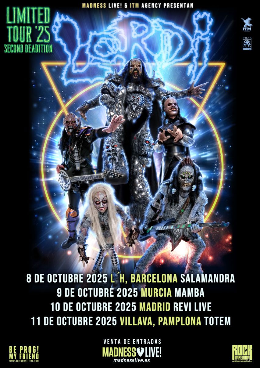Estas son las fechas de la nueva gira de Lordi en España: 8 de octubre en la Salamandra de l’Hospitalet (Barcelona), 9 de octubre en la Mamba de Murcia, 10 de octubre en la Revi Live de Madrid y 11 de octubre en la Totem de Pamplona.