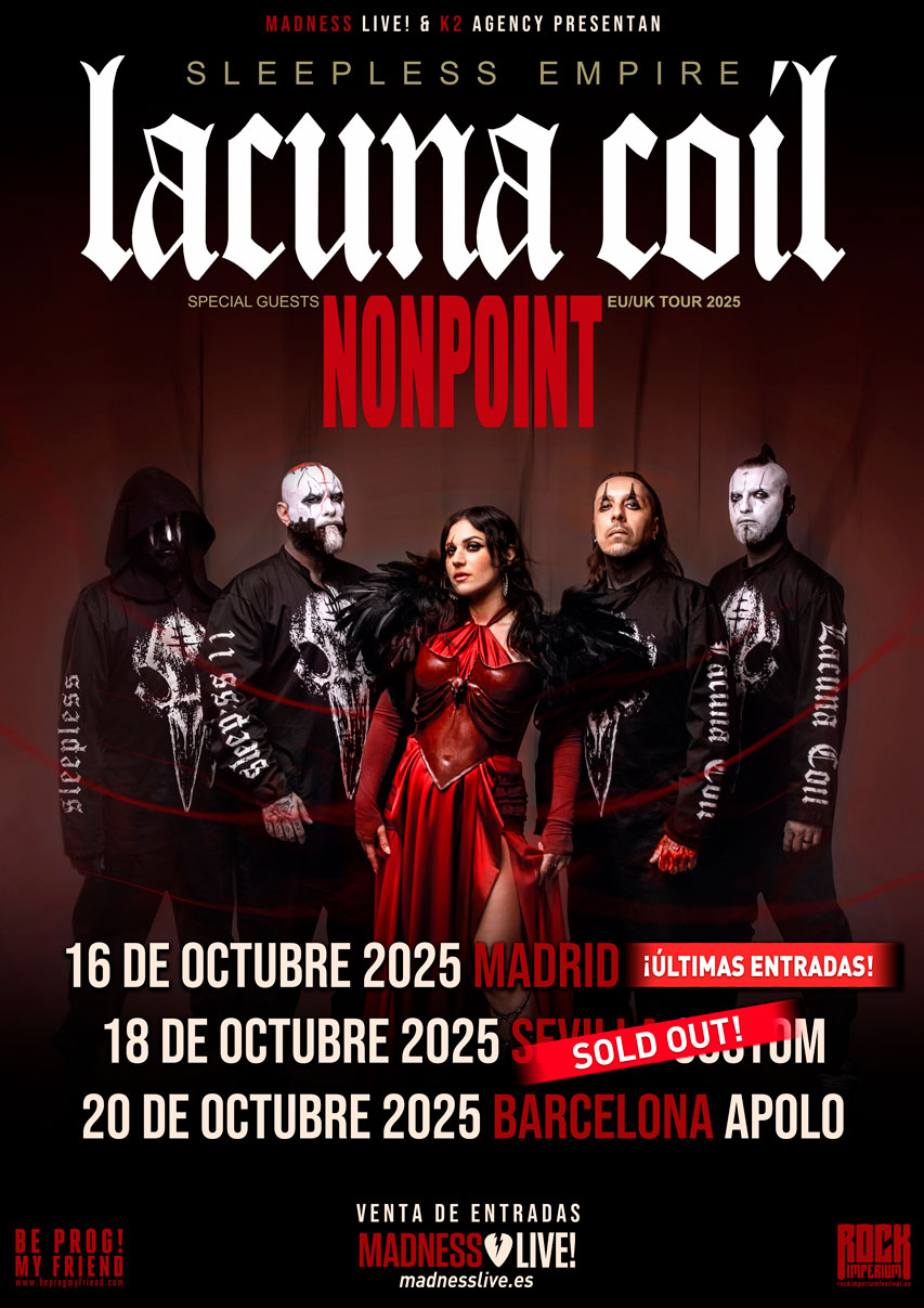La aclamada banda italiana Lacuna Coil se embarcará en una gira por España el próximo mes de octubre para presentar su esperado nuevo álbum, “Sleepless Empire”, que estarán disponible este 14 de febrero. Los seguidores españoles podrán disfrutar de tres conciertos exclusivos en los que la banda ofrecerá su característico sonido metal gótico, lleno de energía y atmósferas únicas. ¡Preparaos para vivir una experiencia única e inolvidable!