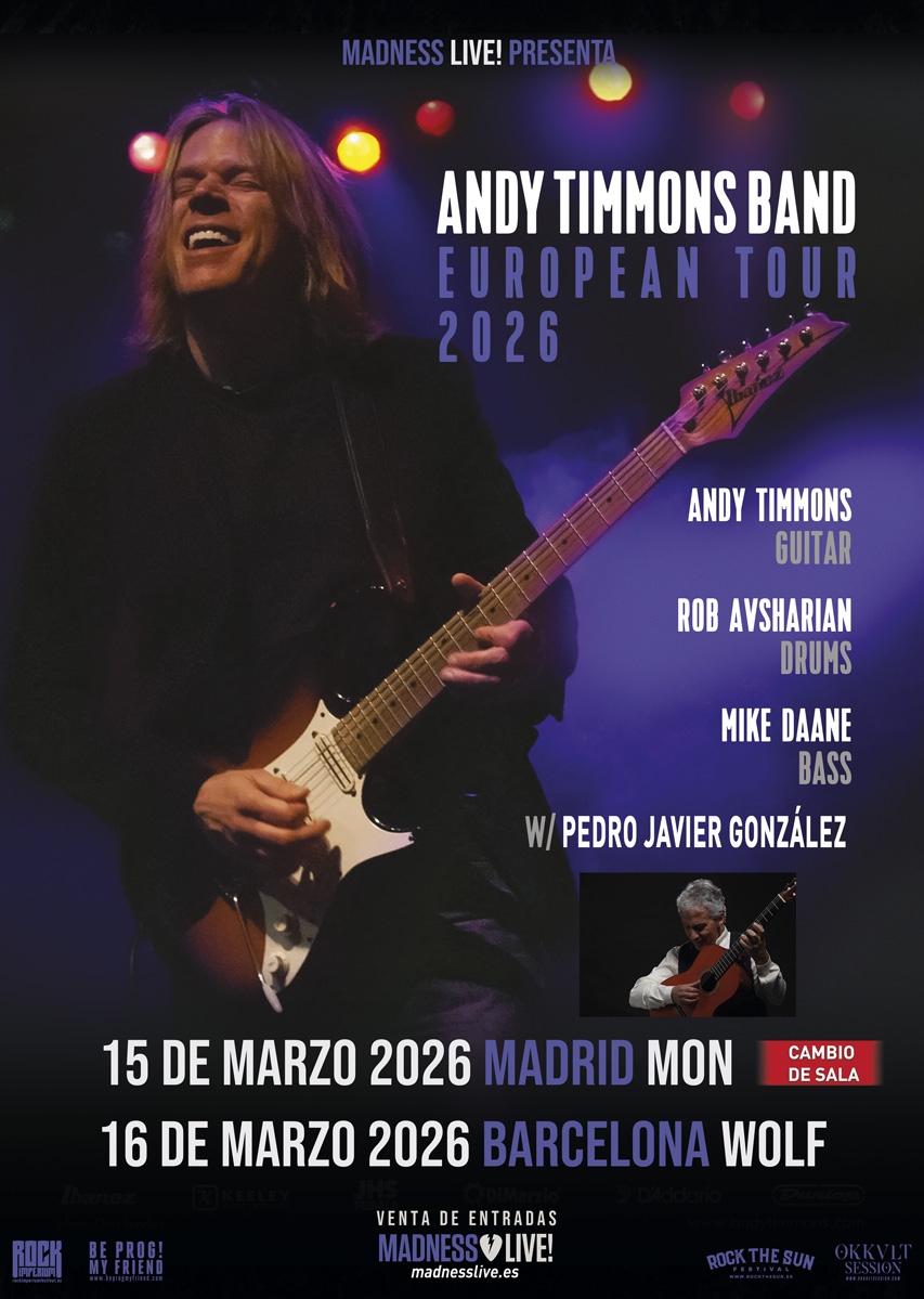 El virtuoso guitarrista estadounidense Andy Timmons visitará España en 2026 para ofrecer dos conciertos; el 15 de marzo en la sala Villanos de Madrid y el 16 de marzo en la sala Wolf de Barcelona. Dos noches únicas para disfrutar en directo del inconfundible estilo de uno de los músicos más versátiles y respetados del mundo de la guitarra.