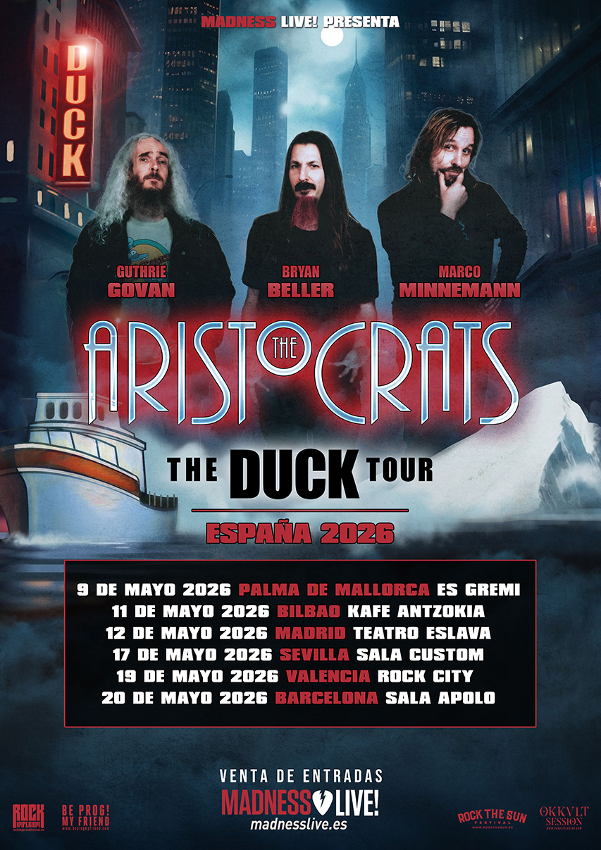 La irreverencia virtuosa de The Aristocrats aterrizará en España el próximo mes de mayo. El explosivo trío instrumental formado por Guthrie Govan, Bryan Beller y Marco Minnemann ofrecerá seis conciertos en nuestro país como parte de su gira europea, presentando en directo su último y ambicioso trabajo de estudio: ‘Duck’.